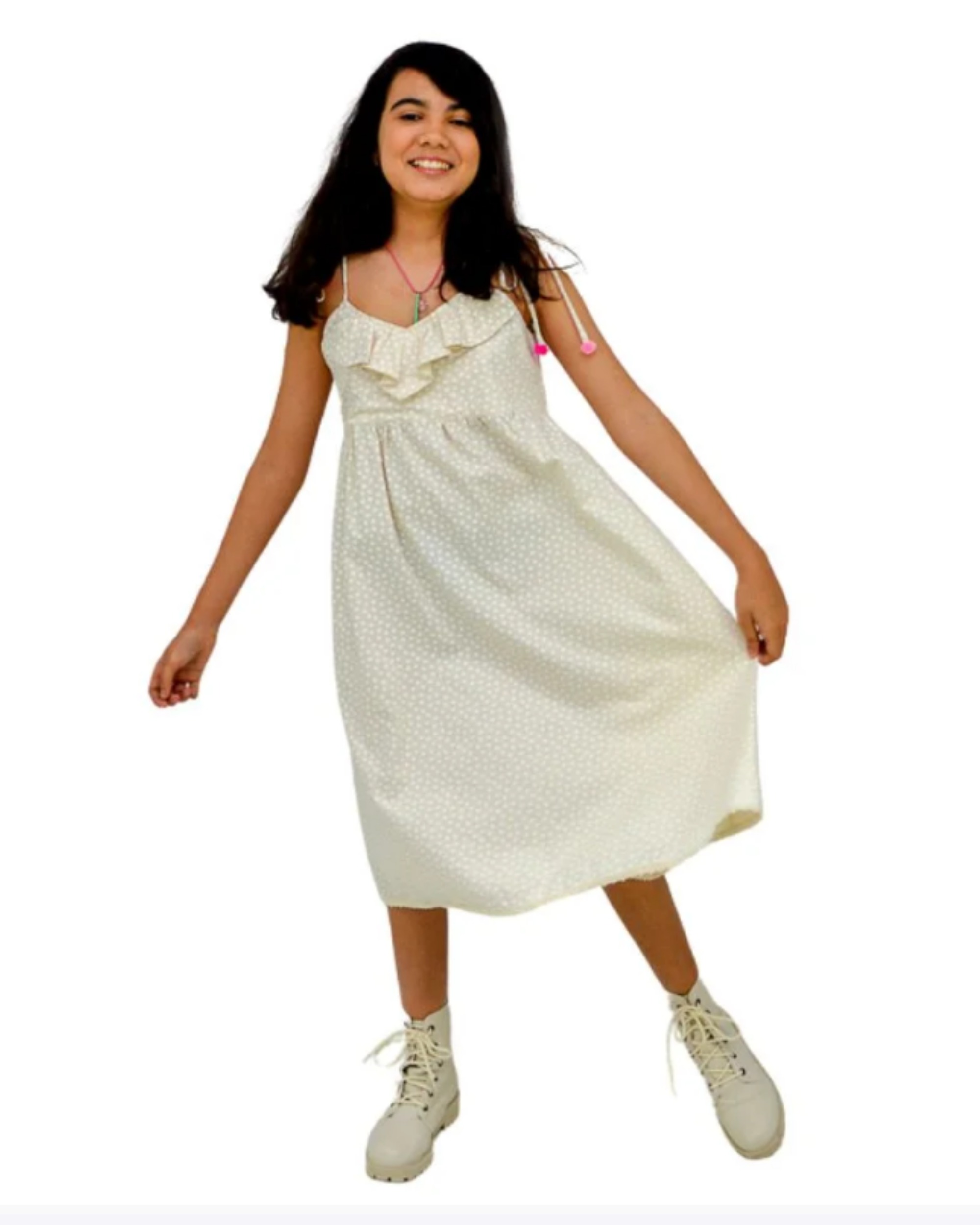 Com detalhes delicados, como a renda na barra e os pompons nas alças, este vestido é uma verdadeira estrela no guarda-roupa infantil.